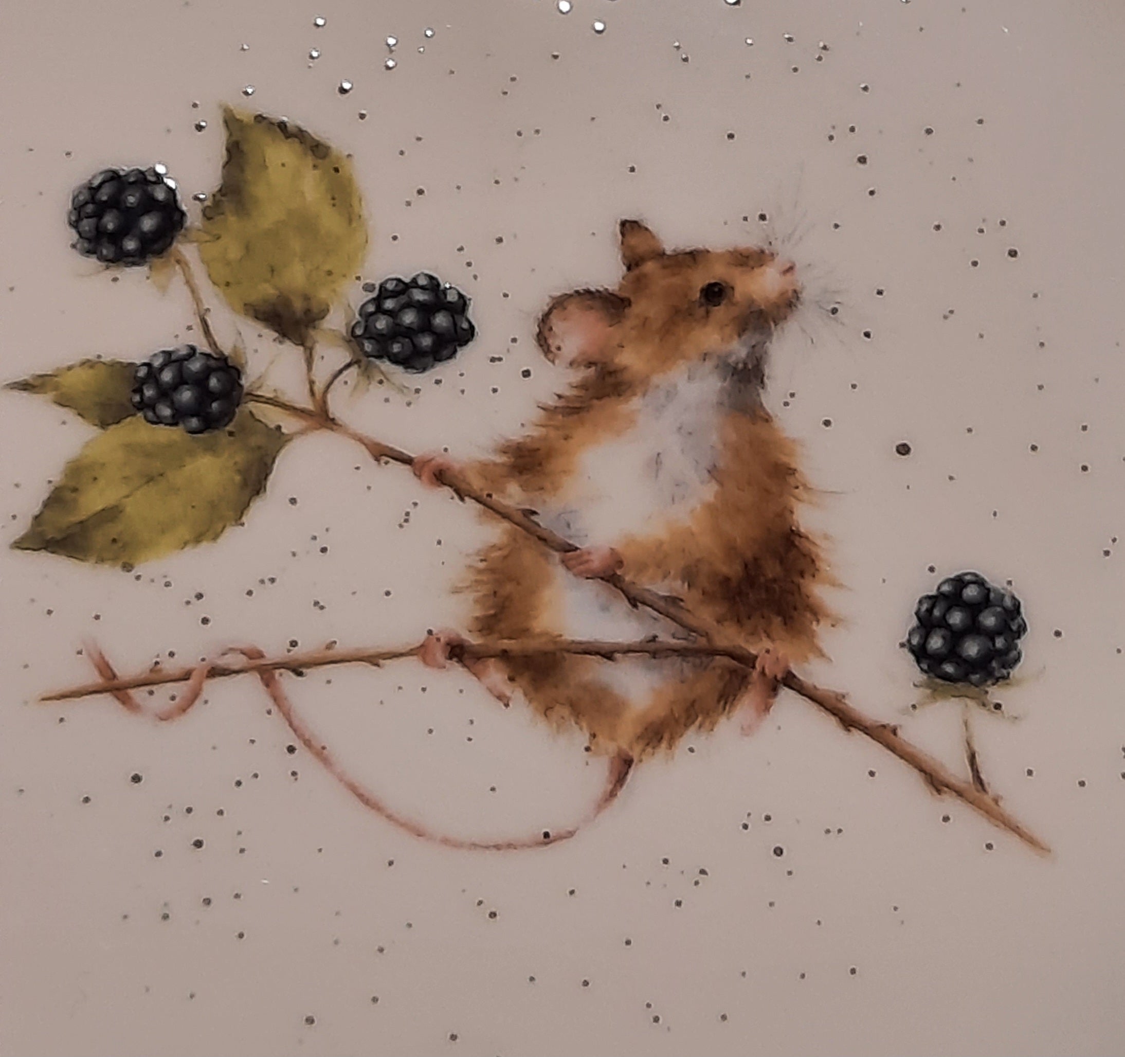 Diese neugierige Feldmaus auf dem Brombeerstrauch bringt einen Hauch von Wildgarten-Idylle auf den Tisch. Basierend auf Hannah Dales Original-Aquarellen und mit feinen Farbtupfern veredelt, besticht das Motiv durch seine lebendige Leichtigkeit und beeindruckende Detailtreue.